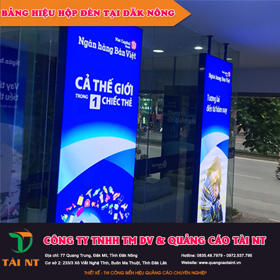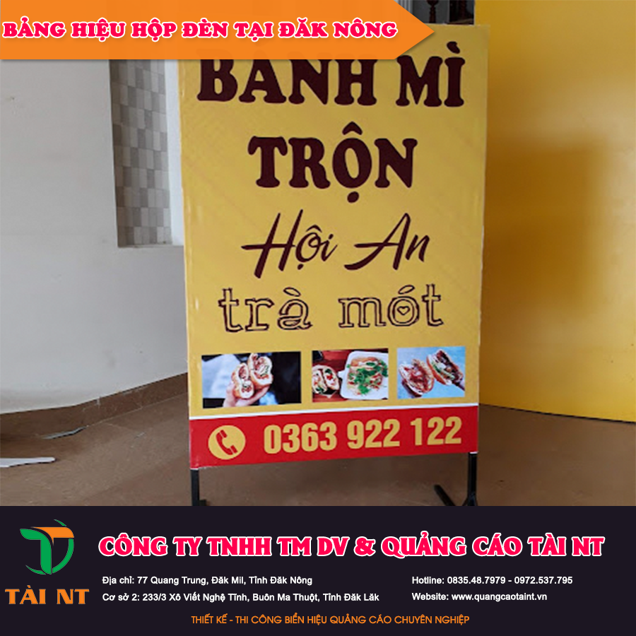 Bảng hiệu hộp đèn là loại biển quảng cáo có cấu tạo dạng hộp, bên trong chứa hệ thống đèn chiếu sáng, thường là đèn LED. Bảng hiệu hộp đèn có thể được làm từ nhiều chất liệu khác nhau như bạt Hiflex, mica, alu,… và được sử dụng phổ biến trong nhiều lĩnh vực,… Công Ty TNHH TM DV & Quảng Cáo Tài NT là một đơn vị chuyên cung cấp dịch vụ thiết kế, làm bảng hiệu giá rẻ tại Đăk Mi chuyên nghiệp, Bảng hiệu hộp đèn tại Đăk Nông.
