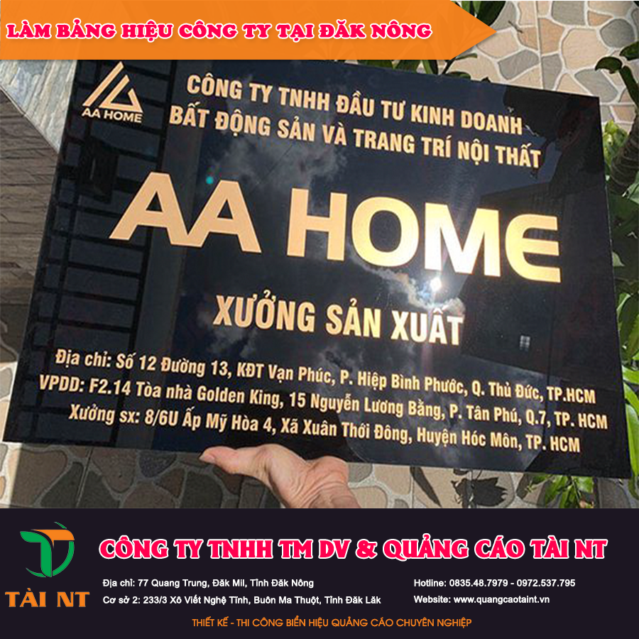 Làm biển bảng hiệu tên công ty là một khoản đầu tư hiệu quả cho doanh nghiệp. Doanh nghiệp nên lựa chọn thiết kế và thi công biển bảng hiệu phù hợp với nhu cầu và ngân sách của mình. Biển quảng cáo công ty là một công cụ marketing hiệu quả, giúp công ty thu hút khách hàng tiềm năng, tăng doanh thu và xây dựng thương hiệu. Do đó, công ty cần đầu tư vào thiết kế và thi công biển quảng cáo công ty một cách chuyên nghiệp để đạt hiệu quả cao nhất. Công Ty TNHH TM DV & Quảng Cáo Tài NT là một đơn vị chuyên cung cấp dịch vụ thiết kế, làm bảng hiệu công ty tại Đăk Nông chuyên nghiệp, Bảng hiệu hộp đèn, mica, chữ nổi tại Đăk Nông.